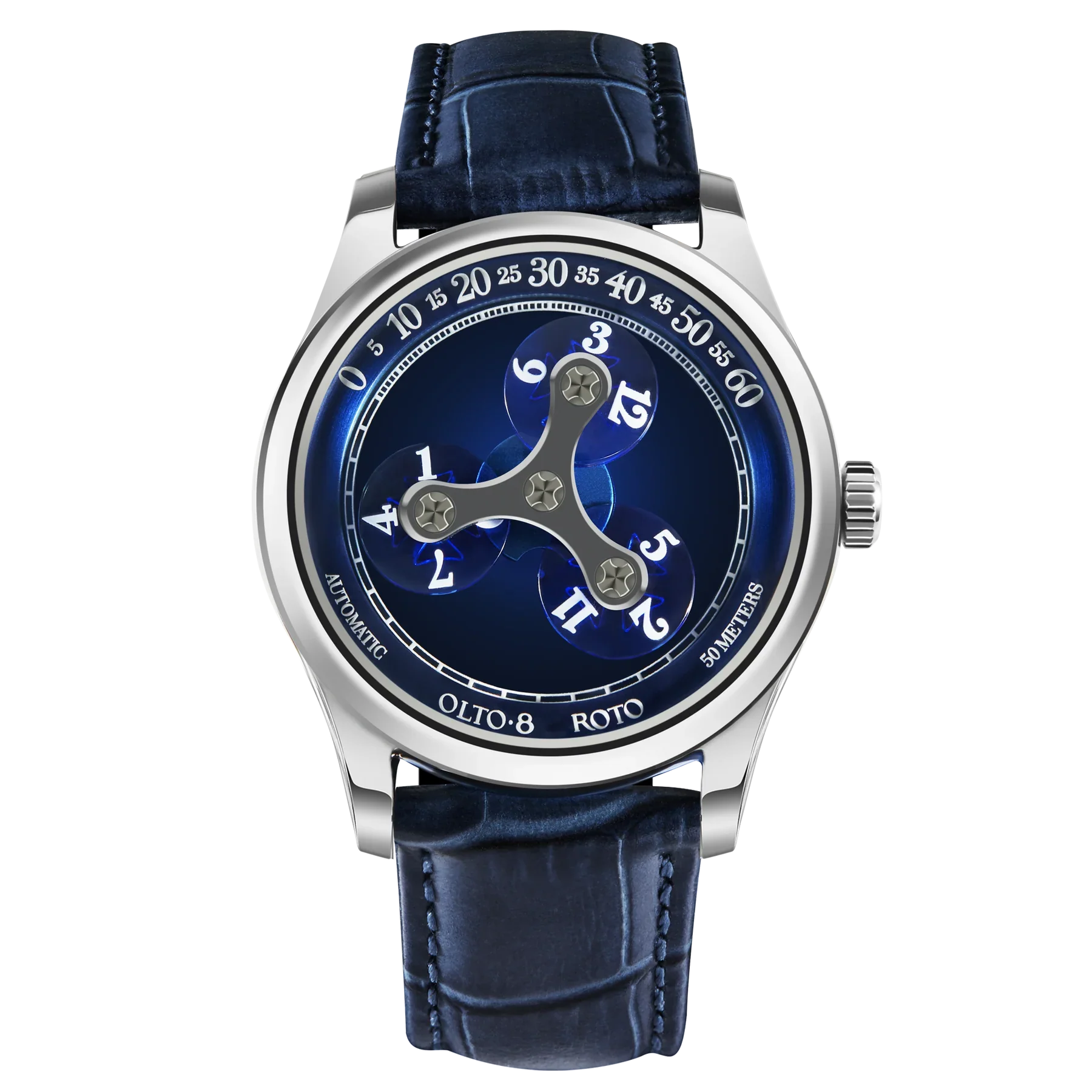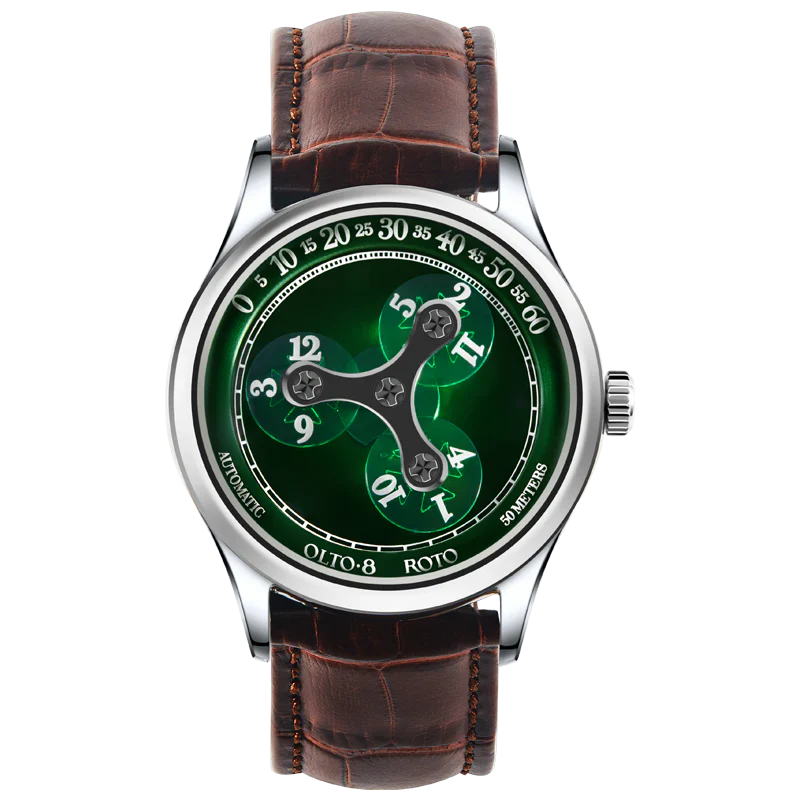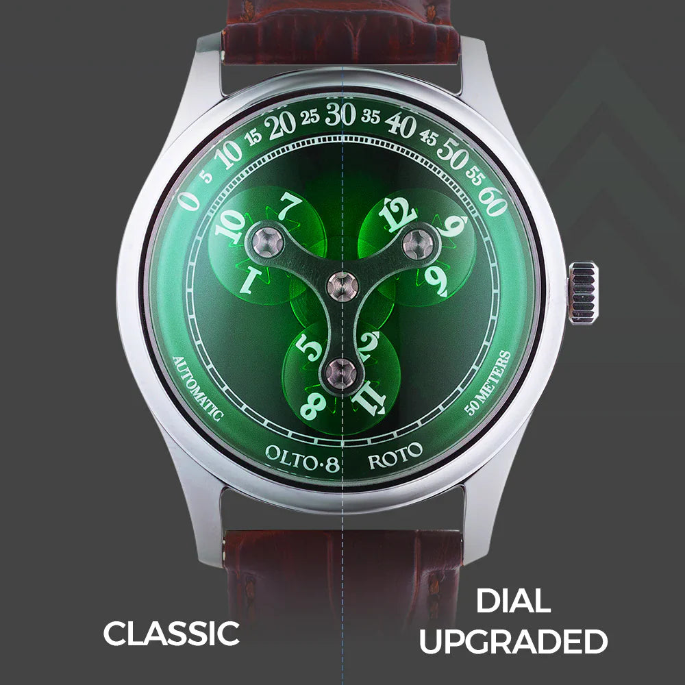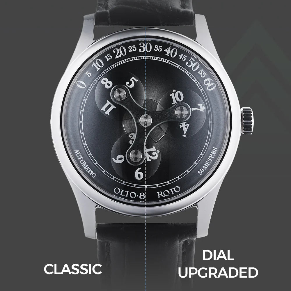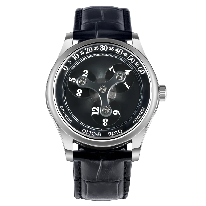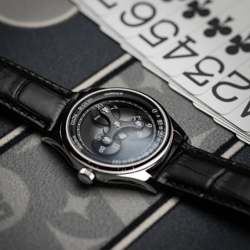 ROTO est dotée d'un boîtier circulaire de 38 mm méticuleusement fabriqué en acier inoxydable 316L de première qualité. Avec une épaisseur de seulement 9 mm,ROTO est la montre à heure errante la plus fine au monde. Chaque surface du boîtier est polie à la main pendant plus de 10 processus, soit plus de 120 minutes de polissage, ce qui permet d'obtenir une finition élégante et rayonnante.