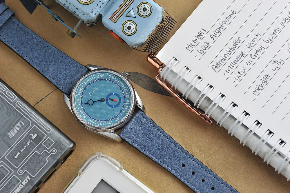 La Vario Single Hand est conçue pour ceux qui souhaitent ralentir le rythme et profiter pleinement de l’instant présent. Avec son affichage à une seule aiguille, elle vous permet de lire l’heure de manière approximative, évitant ainsi l’obsession des minutes qui défilent. Chaque marqueur représente 15 minutes, offrant une lecture fluide et apaisante du temps.