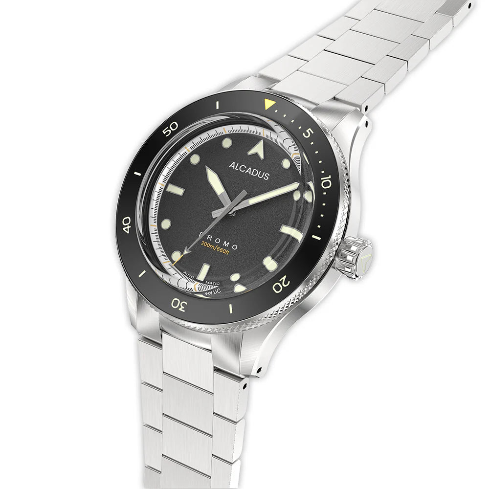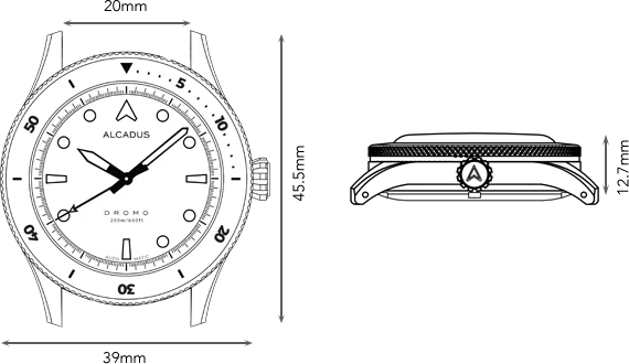 La Dromo dégage un charme vintage raffiné. Dotée d'un boîtier en acier inoxydable 316L de 39 mm, ses flancs de 45,5 mm arborent une finition brossée verticale, tandis que les cornes présentent une texture brossée circulaire.Rehaussant le design intemporel, un chanfrein conique poli le long de l'épaulement de la corne ajoute une touche de sophistication à cette montre classique.