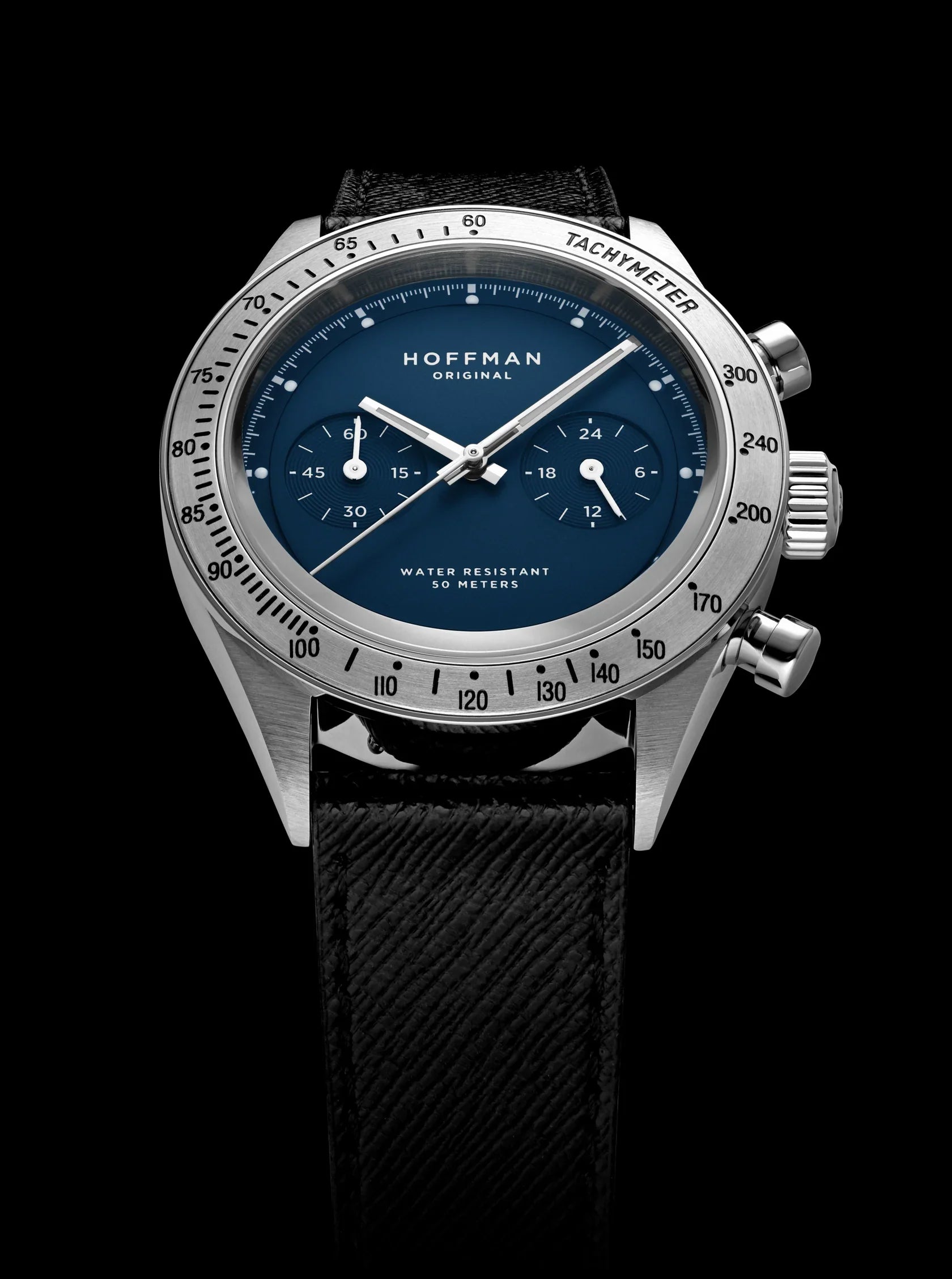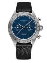 La All Blue se présente dans un boîtier en acier poli et brossé, complété par une lunette en acier brossé gravée d’une échelle tachymétrique. Son cadran à double couche, habillé d’un bleu vintage, est sublimé par des motifs circulaires embossés qui rehaussent les sous-cadrans tout en ajoutant de la profondeur au design. Les sous-cadrans affichent les minutes du chronomètre à 9 heures et l’heure sur 24 heures à 3 heures. Un bracelet en cuir Saffiano noir, accompagné d’une boucle en acier poli et brossé, vient parfaire cette pièce avec raffinement.