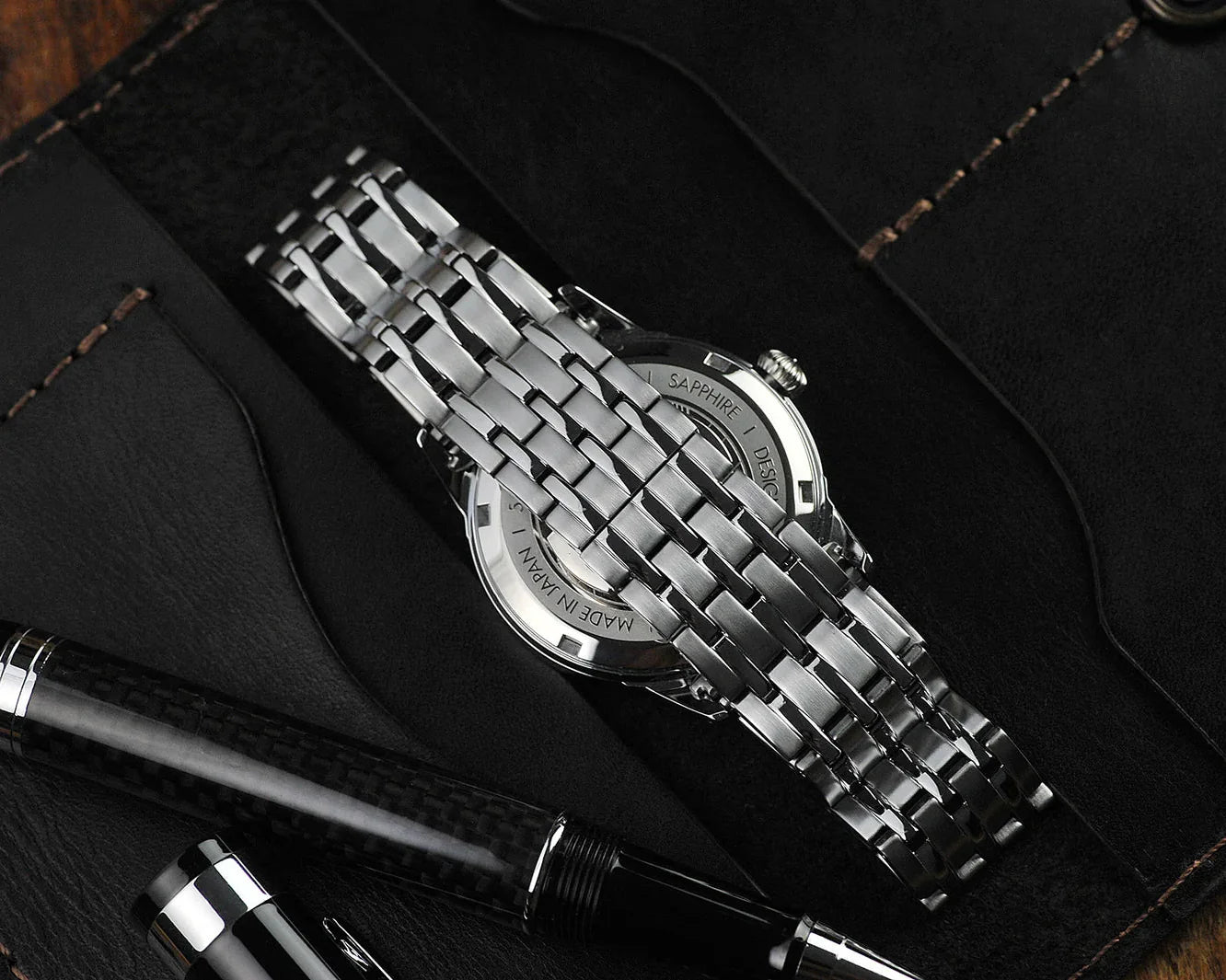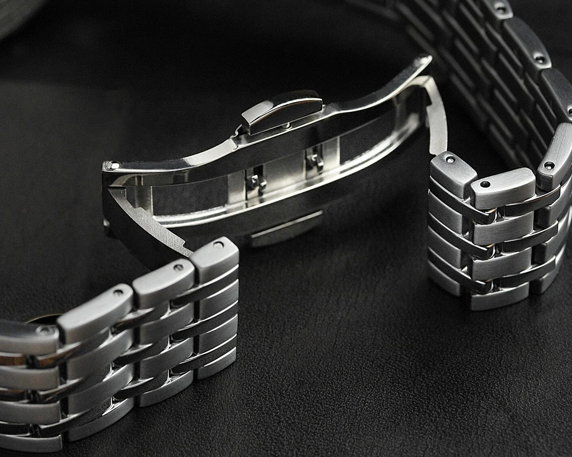 תנו לשעון Empire שלכם מראה חדש ורענן עם צמיד מתכת יוקרתי זה מבית Vario. צמיד זה, העשוי מפלדת אל-חלד, באורך 20 מ"מ בלולאות ובאורך 18 מ"מ בסוגר המתקפל, משלב עיצוב רטרו-שיק עם נוחות מודרנית. הוא כולל חוליות קצה מוצקות שתוכננו להתאים באופן מושלם למארז השעון, וחצאי חוליות לכוונון מדויק של פרק כף היד. טיפול פני השטח העמידים בפני שריטות משמר את הברק והעמידות של הצמיד. צמיד זה תואם לכל דגמי Vario Empire ומשנה את מראה השעון שלכם תוך דקות.