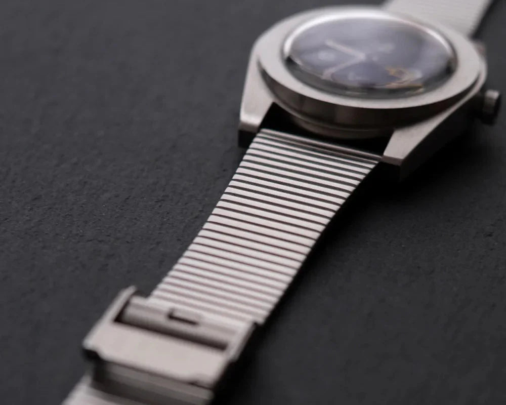 עשוי מפלדת אל-חלד, הוא מציע עמידות מעולה תוך שמירה על נוחות לשימוש יומיומי. רוחבו 20 מ"מ, שמתחדד בעדינות ל-16 מ"מ, צר את פרק כף היד ומשפר את האלגנטיות שלו. הודות לקפיצי השחרור המהיר, החלפת הרצועה אורכת שניות בלבד וללא צורך בכלים.