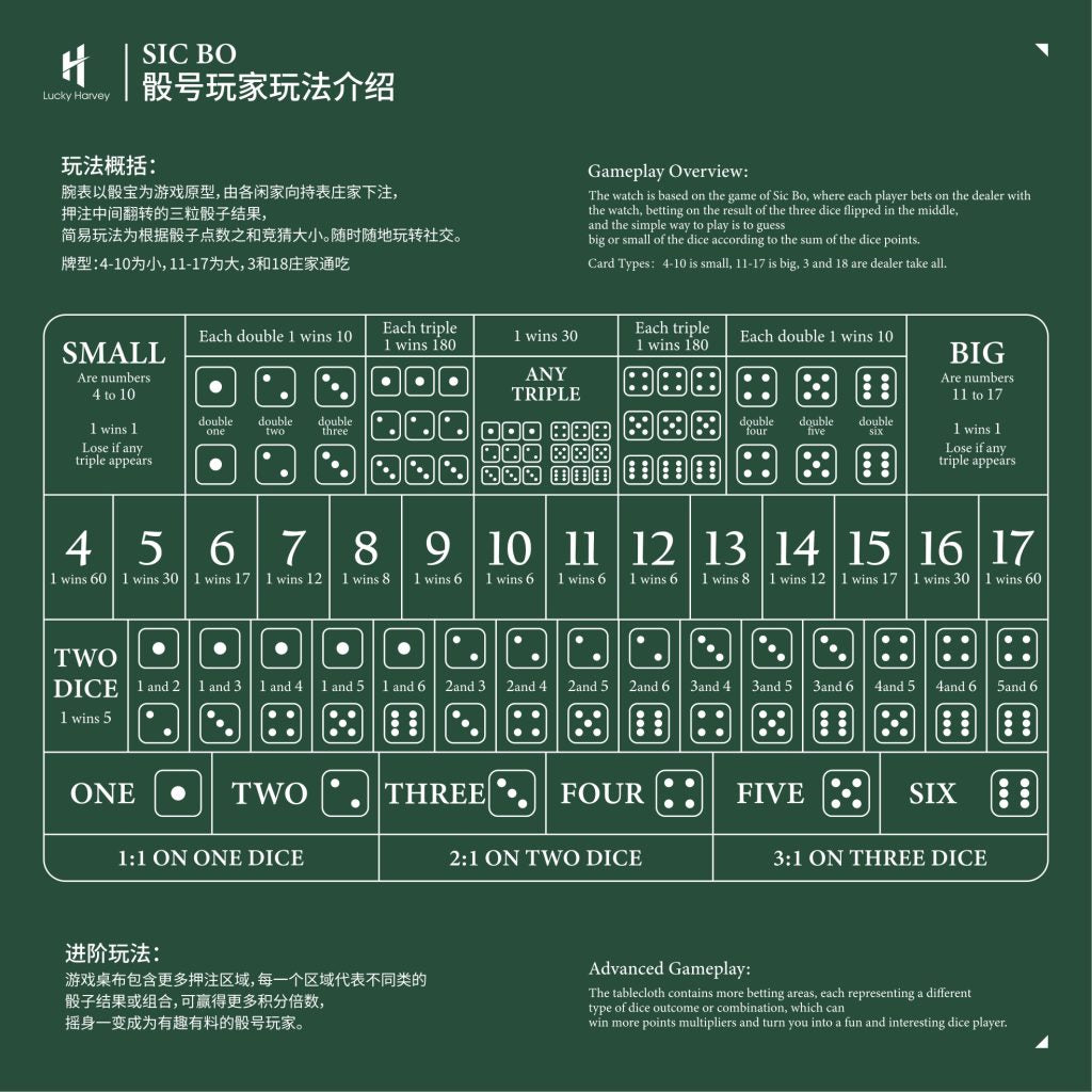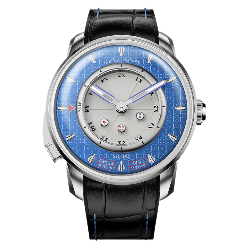 שעון ה-Lucky Harvey Sic Bo Blue משלב אלגנטיות שעונים עם עולם המשחקים. בהשראת משחק הקוביות האסייתי הפופולרי Sic Bo, הוא כולל לוח מחוגים מפורט וייחודי בצבע כחול עמוק שובה לב. עיצוב לוח המחוגים החדשני משלב מוטיבים של קוביות ומשחקים, ומציע נופך ייחודי למי שמעריך מקוריות. שעון זה, המופעל על ידי מנגנון אוטומטי מדויק ומוגן על ידי מארז נירוסטה חזק, מבטיח עמידות וסגנון כאחד. עם קריסטל ספיר עמיד בפני שריטות וצבעו התוסס, ה-Sic Bo Blue מושלם למי שמחפש שעון נועז ואלגנטי. פשוט לחצו על הכפתור בשעה 8 והדיסק המרכזי יסתובב כדי לגלגל את שלוש הקוביות.