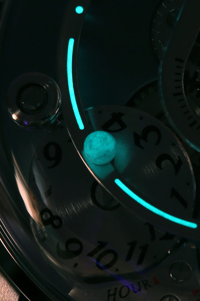 Sur le cadran, un globe en forme de dôme représentant la Terre tourne une fois toutes les 24 heures à la position 12h00, servant d’indicateur jour/nuit. À ses côtés, un petit globe représentant la Lune effectue une rotation autour de la Terre sur un cycle de 28 jours, recréant avec précision le mouvement lunaire.