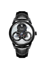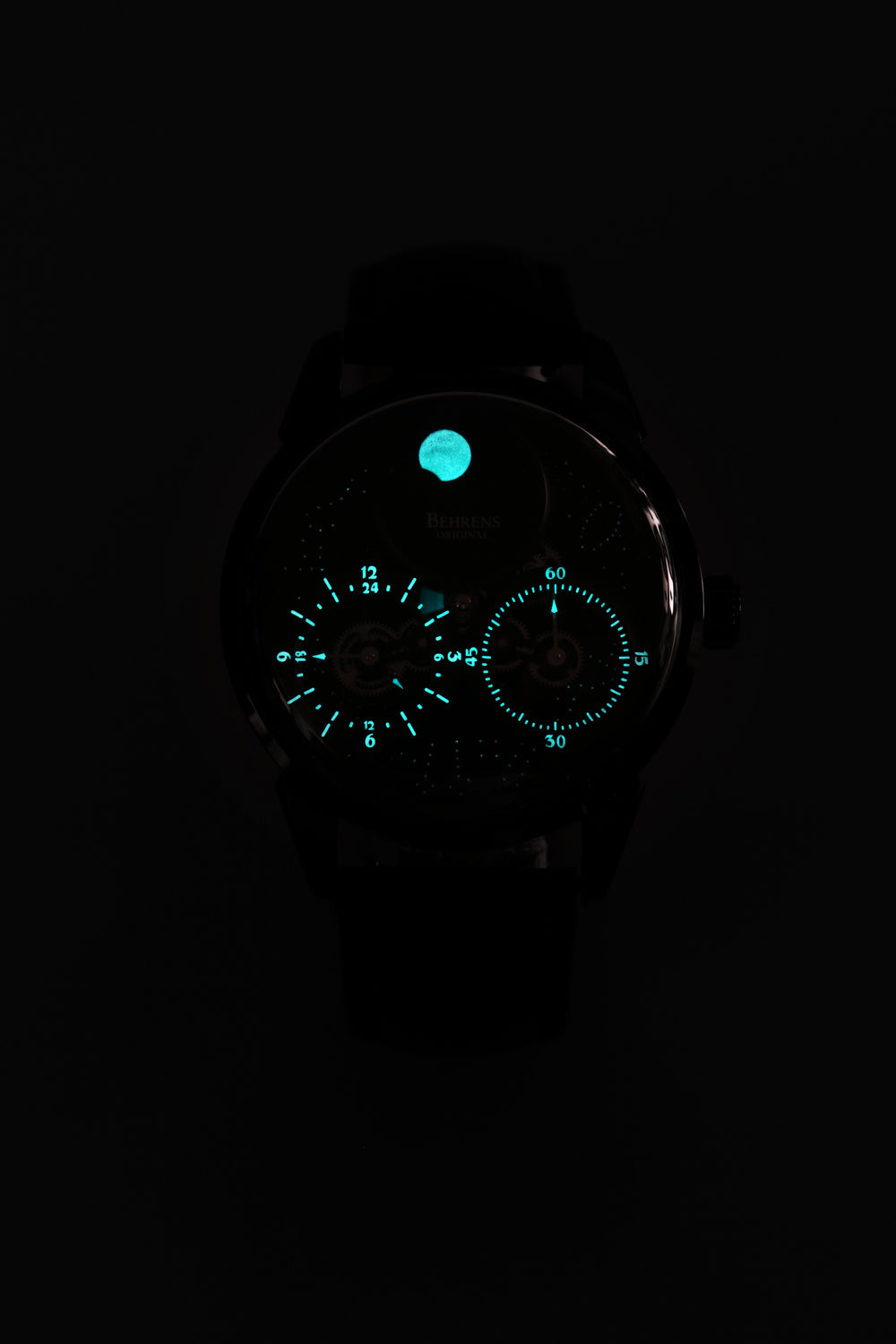 Les fonctions horaires sont réparties sur trois compteurs isométriques. À 7h30, l'affichage des heures est accompagné d'une aiguille bleue secondaire pour l'indication jour/nuit sur 24 heures. À 4h30, un compteur dédié aux minutes et, au centre, une aiguille des secondes trotteuse offrent une précision optimale. À 12h00, une véritable phase de lune indique fidèlement la position de l'astre.