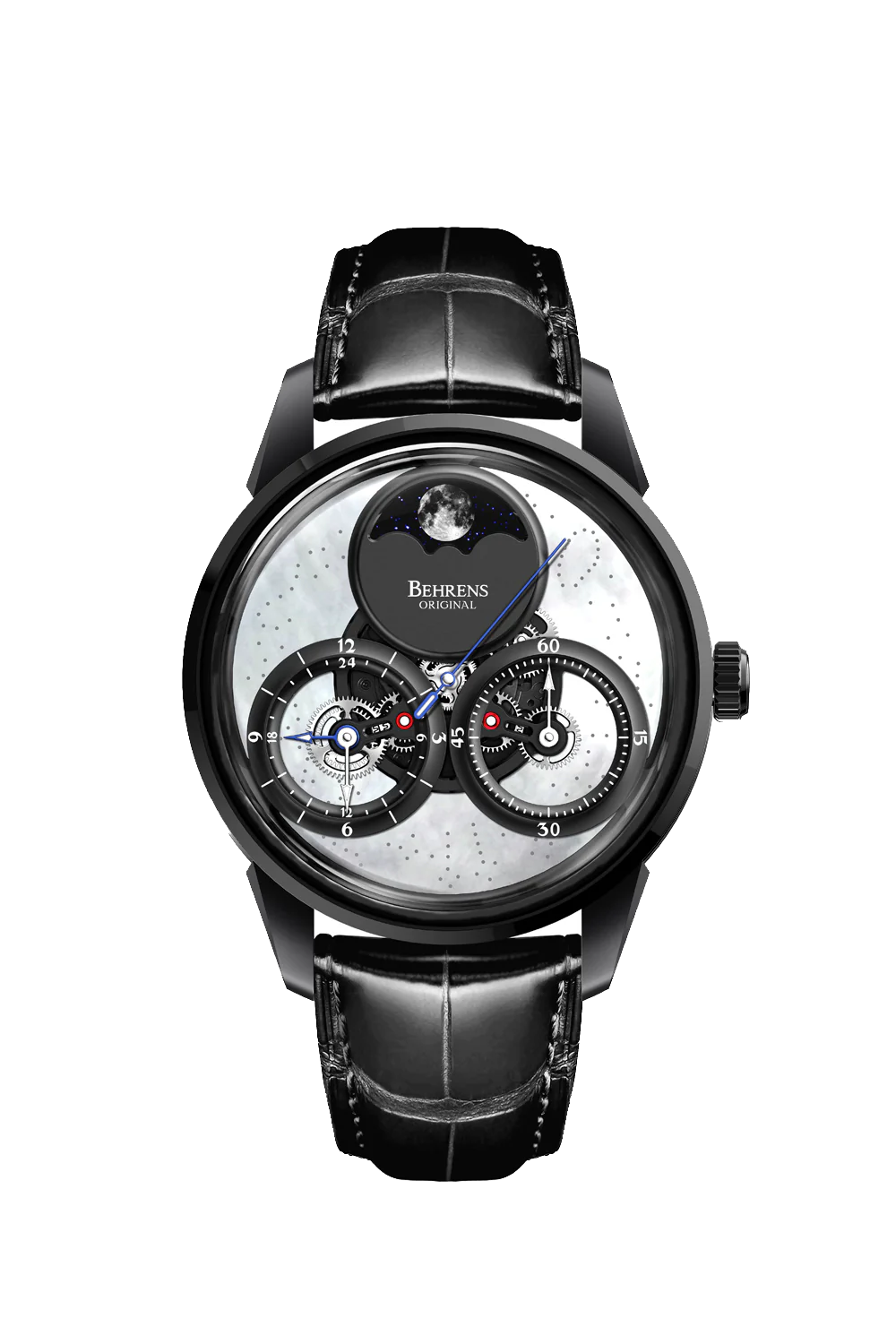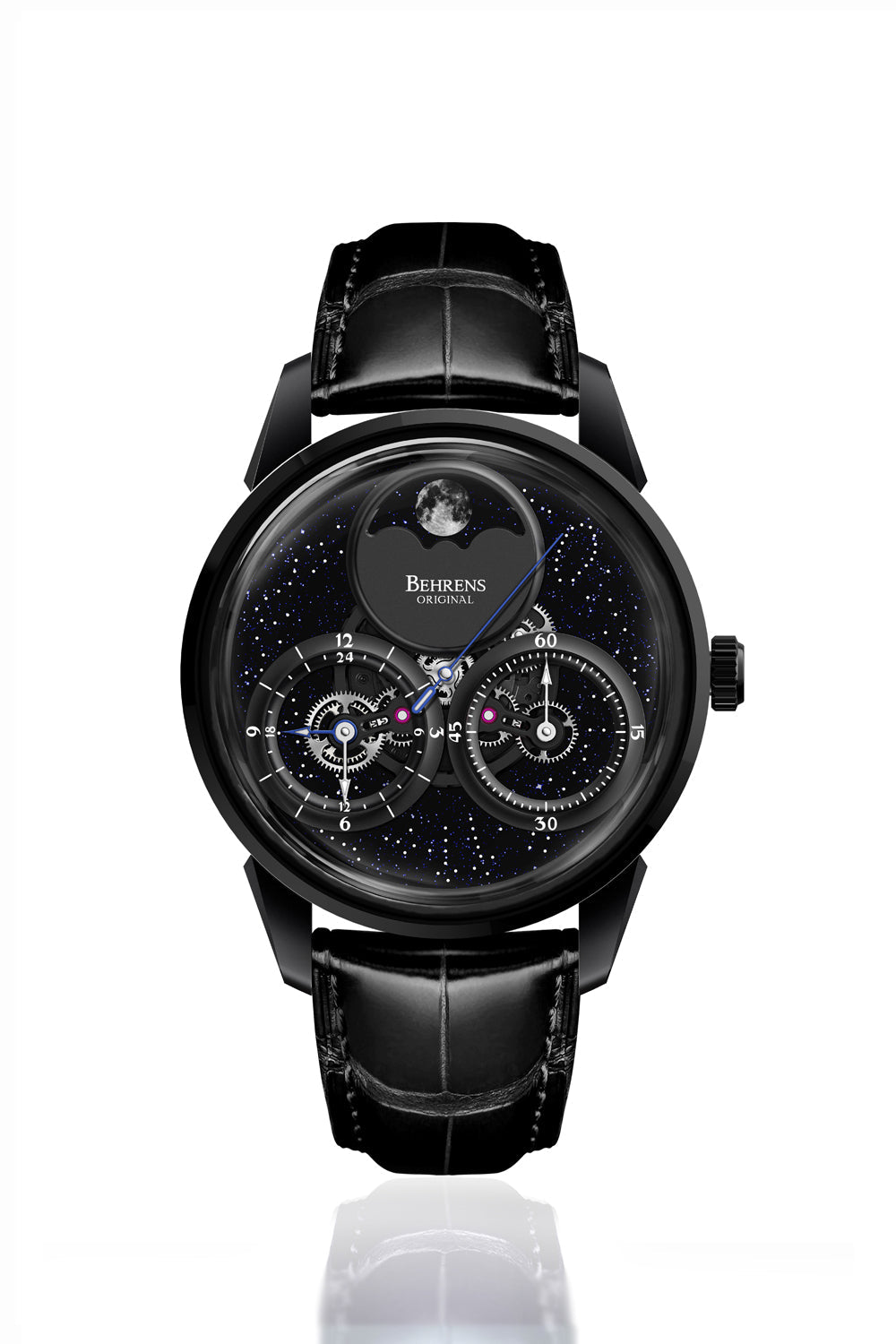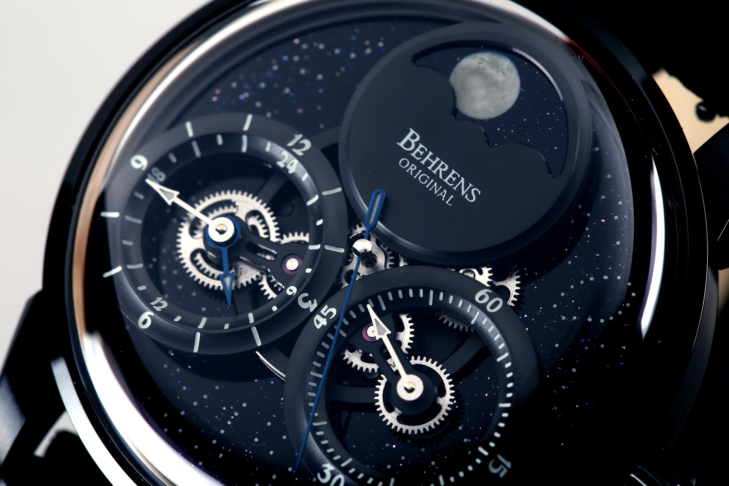 La Behrens Consteller Regulator est une montre mécanique unique, inspirée par la beauté du ciel étoilé. Dotée d'un cadran en aventurine bleu foncé orné d’un motif étoilé, cette montre rappelle les mystères de la nuit et s’inscrit dans la tradition de Behrens d’incorporer des éléments célestes dans ses créations. Le modèle CONSTELLER, lancé en 2022 dans la collection « Original », propose une lecture de l'heure innovante sous forme de régulateur.