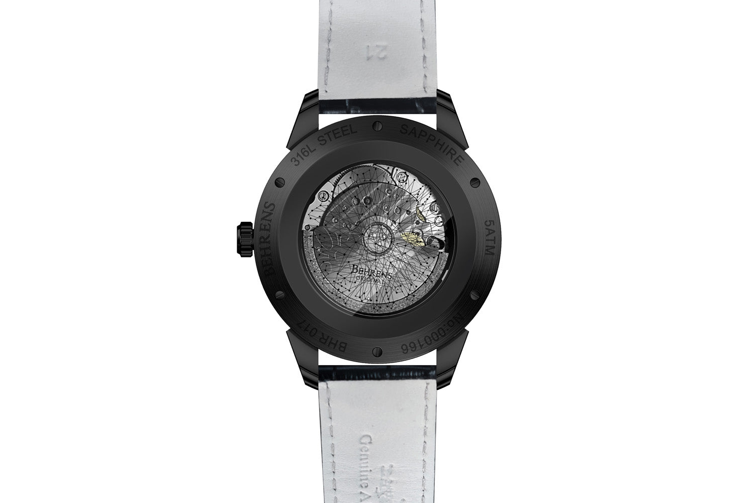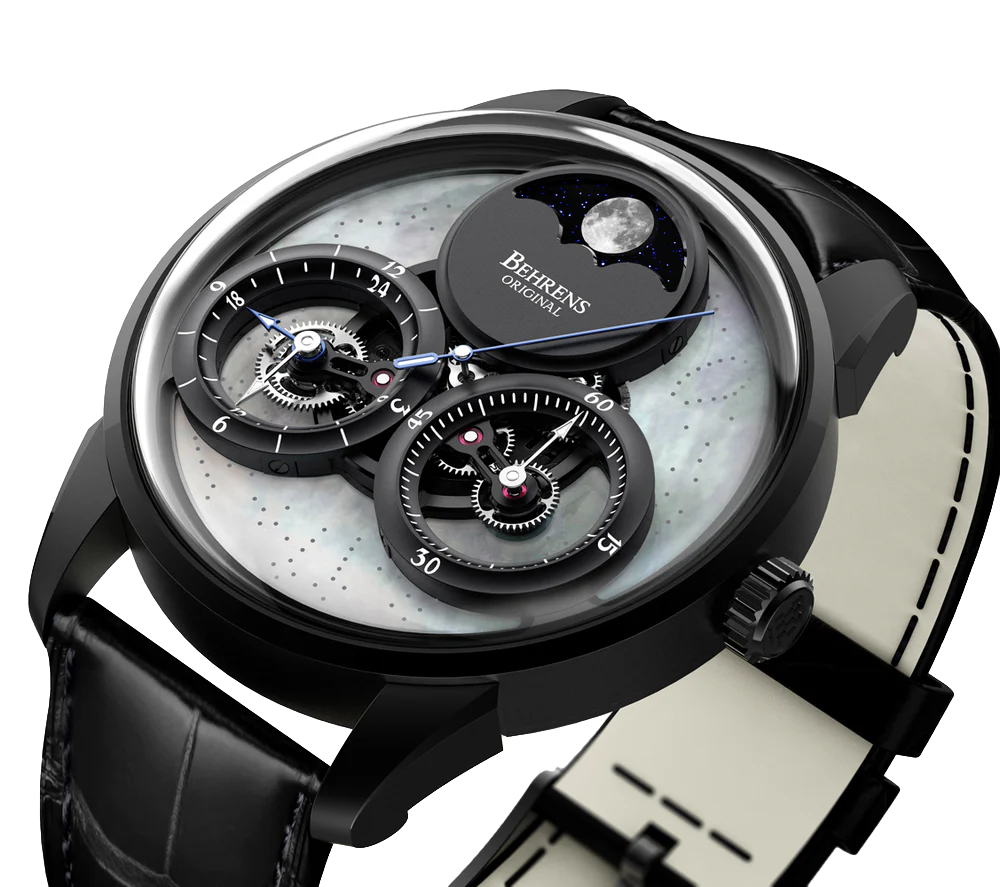 Le boîtier de 42 mm en acier inoxydable 316L noirci, signature de la maison Behrens, complète l’ensemble avec élégance et robustesse. Un verre saphir bombé antireflet protège le cadran, assurant une visibilité parfaite sous tous les angles. La Behrens Consteller Regulator est une montre qui marie innovation mécanique et esthétisme céleste, idéale pour les amateurs d’horlogerie qui apprécient les designs avant-gardistes.