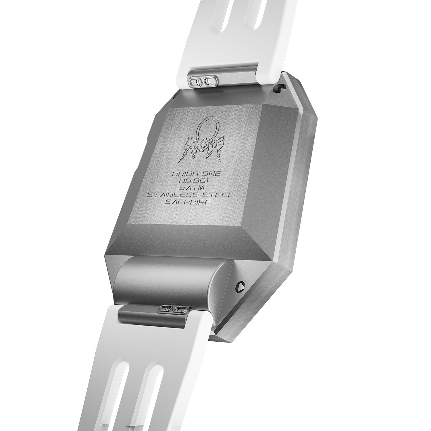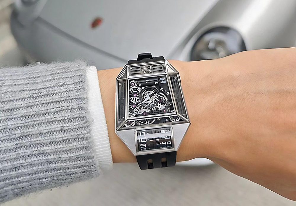 L'affichage de l'heure est présenté à 6h00 sur deux rouleaux 3D lumineux, l'un pour les heures et l'autre pour les minutes, activés par des engrenages complexes qui apportent une grande lisibilité. Au centre du cadran, une aiguille des secondes en forme de « radar » ajoute une touche de mystère. L'Orion One dispose également d'un indicateur jour/nuit linéaire à 12h00, d'une date avec loupe à 1h30, et d'un fond de boîtier gravé d'un motif « Alien ».