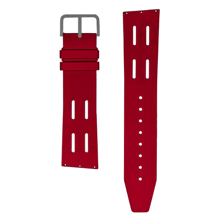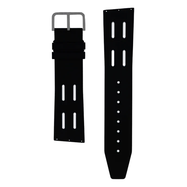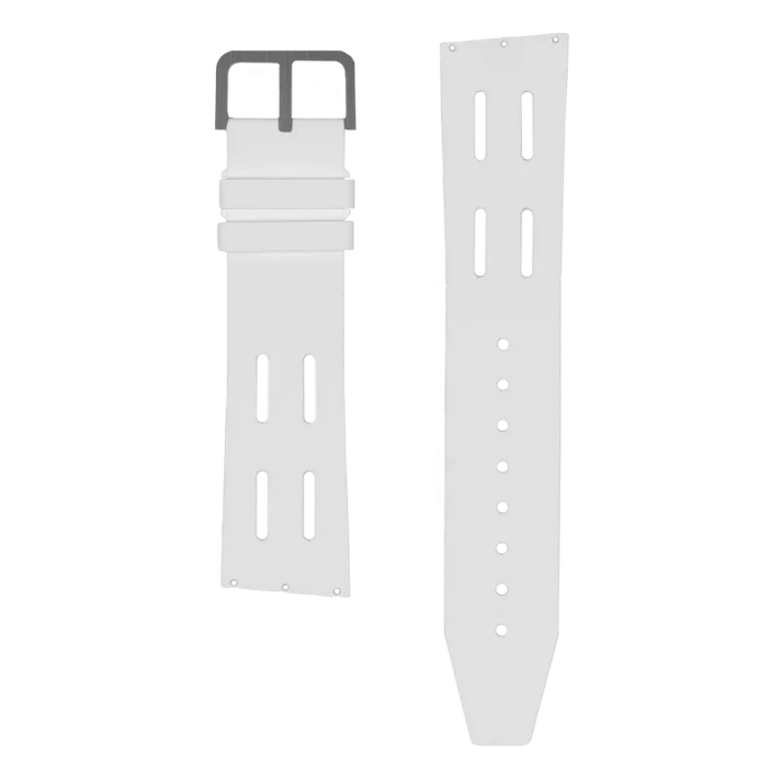 Bracelet en caoutchouc, avec système de fixation rapide pour faciliter le changement en appuyant sur le bouton situé à l'arrière du bracelet, au niveau des cornes.