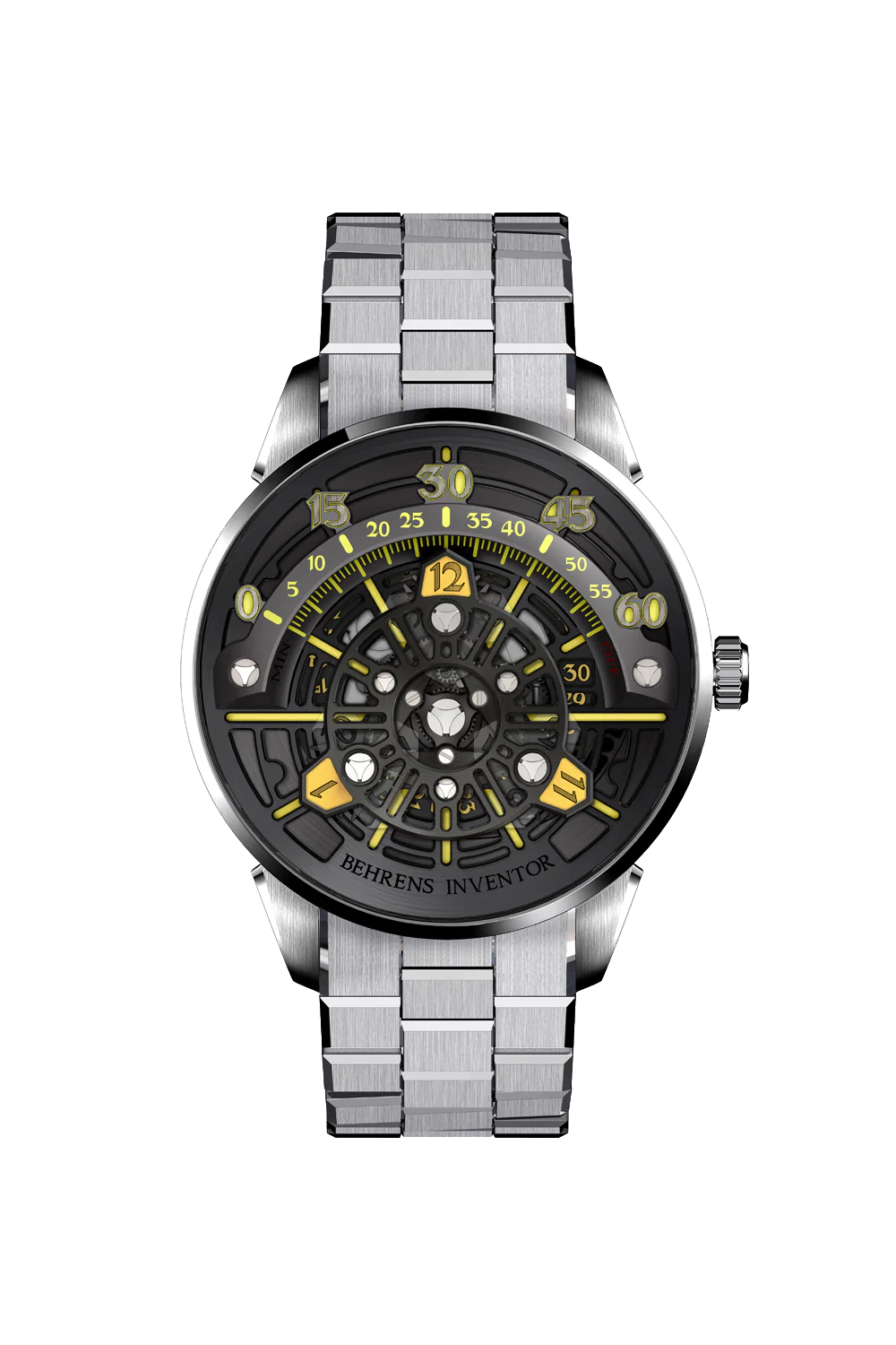Le module satellite de la B023 utilise un système à 3 disques qui tourne autour du cadran, cachant la majorité des chiffres et ne révélant que 3 indicateurs d'heure à la fois, comme un code secret à déchiffrer. Le cadran, orné de motifs inspirés du "Da Vinci Code", intègre également un affichage de la date à 2h30, ajoutant fonctionnalité et élégance. Ce modèle est livré avec un bracelet en métal breveté, équipé d'un système de bouton-poussoir pour un réglage facile et sans outil de la longueur du bracelet.